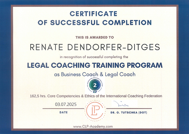 Our partner, Prof. Dr. Renate Dendorfer-Ditges, is now a Legal Coach. After completing a six-month training program accredited by the renowned International Coaching Federation (ICF) to become a Business & Legal Coach, she has expanded her legal expertise to include professional coaching skills in her client work.